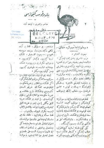 Nüzhet Sabit’in yayınladığı "Binbir Kuş Kütüphanesi 2" adlı fasikülün içerisinde "Devekuşunun Mebuslara Hitabı" başlıklı yazının fotokopisi.
